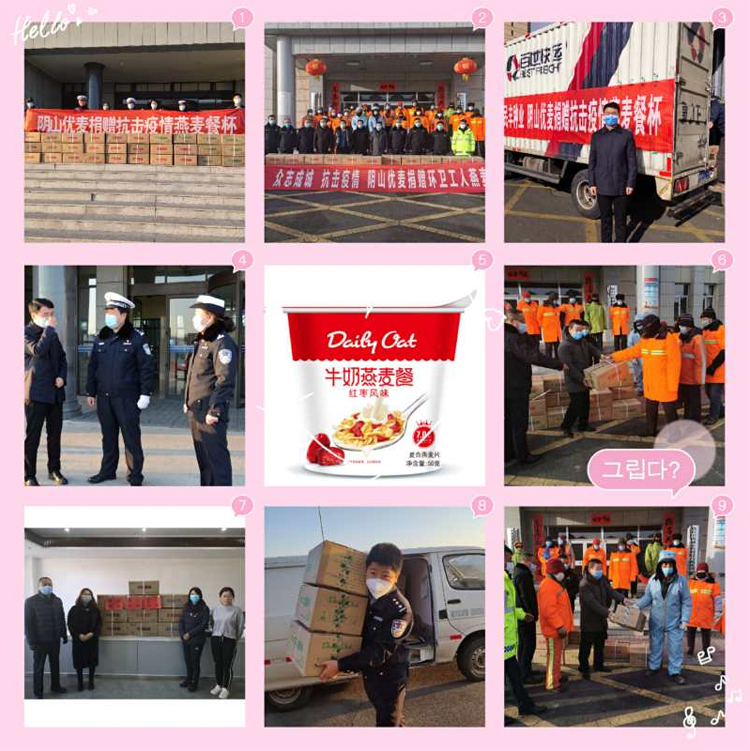 2月2日公司通過集寧區(qū)紅十字會捐贈燕麥餐杯9000只,2月7日通過察右中旗紅十字會捐贈燕麥餐杯 3300只,2月12日向抗擊在疫情一線的烏蘭察布市交警支隊捐贈燕麥餐杯1500只,2月14為堅守疫情防控一線的城管環(huán)衛(wèi)人員送上燕麥餐杯1650只,2月16日為集寧區(qū)橋東街道泉山北街社區(qū)一線工作人員送上燕麥餐杯300只。截止目前,公司已累計捐贈燕麥餐杯15750只,為抗擊疫情一線的工作人員提供了健康、方便的營養(yǎng)支持!
