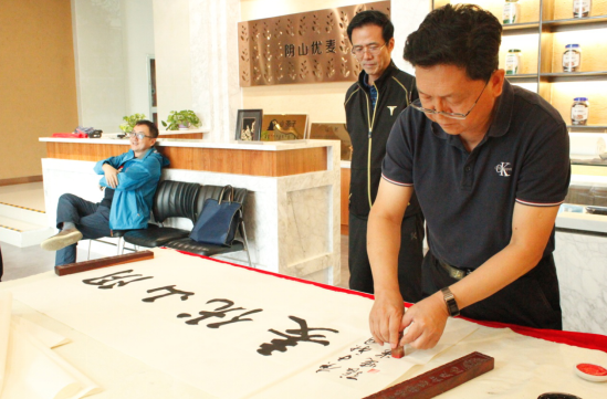 隨后,大家又來到燕麥博物館,感受燕麥文化、體驗(yàn)燕麥產(chǎn)品的同時(shí),并現(xiàn)場(chǎng)目睹書法名家張曉華老師的揮毫潑墨。孟才介紹,中國燕麥的市場(chǎng)份額在100億元以上,裸燕麥起源于中國,但是國內(nèi)燕麥深加工所用的原糧90%是進(jìn)口皮燕麥,只有10%是國產(chǎn)裸燕麥,主要原因是國產(chǎn)裸燕麥多采用傳統(tǒng)旱作耕作方式,人工除草,有機(jī)種植,不使用除草劑、農(nóng)藥、化肥等,畝產(chǎn)較低。但是,也正因如此裸燕麥的口感更好、質(zhì)量更佳且蛋白質(zhì)、脂肪、β-葡聚糖等營養(yǎng)成分均高于皮燕麥。得天獨(dú)厚的資源優(yōu)勢(shì)是陰山優(yōu)麥建企立身的根基和市場(chǎng)競(jìng)爭(zhēng)的底氣,產(chǎn)品全部采用優(yōu)質(zhì)的國產(chǎn)裸燕麥就是陰山優(yōu)麥的核心競(jìng)爭(zhēng)力!