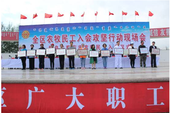 6月14日,全區(qū)農(nóng)牧民工入會攻堅行動現(xiàn)場會暨烏蘭察布市農(nóng)牧民工入會儀式在我市舉行。我公司組織30人的方隊參加了入會儀式。期間,自治區(qū)人大常委會副主任、總工會主席杭桂林,自治區(qū)總工會黨組書記、副主席崔明龍,自治區(qū)總工會副主席王麗紅,我市領(lǐng)導(dǎo)張琛、李建平、楊國文、王增強(qiáng)、王國相、于生龍,和各盟市工會分管主席、主管部門部長,各盟市黨委政府所在地的區(qū)(市、旗)總工會主席,各自治區(qū)產(chǎn)業(yè)工會負(fù)責(zé)人,自治區(qū)直屬機(jī)關(guān)工會工委負(fù)責(zé)人,區(qū)總相關(guān)部門負(fù)責(zé)人,市各旗縣市區(qū)工會負(fù)責(zé)人及部分市直基層工會負(fù)責(zé)人100余人來我公司進(jìn)行了實地觀摩考察。